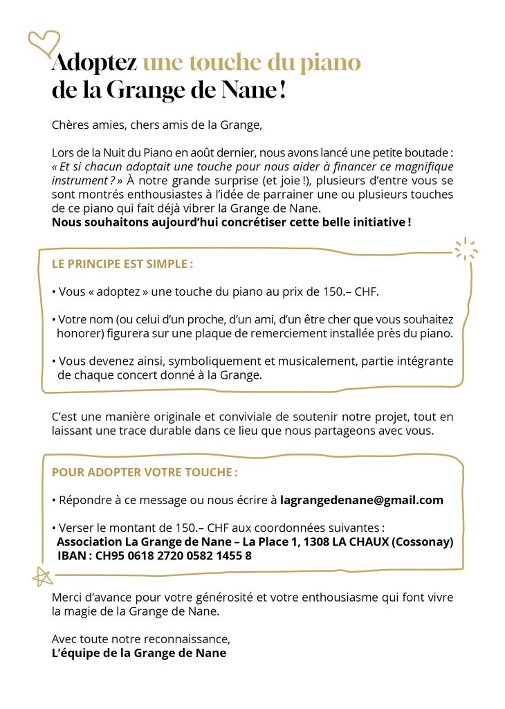 Depuis 2019, La Grange de Nane a contribué à cette vie culturelle en accueillant dans ses murs plusieurs concerts : « Les jeunes fêtent la Musique » (avec 60 jeunes de 9 à 19 ans) ; le quintet « Tango Sensations » avec Stéphane Chapuis ; la création de « La Nuit du Piano » (avec 8 pianistes classiques et jazz) ; le groupe de jazz ethno « The Band Beyond Borders ». Mais ce projet a aussi d’autres objectifs…